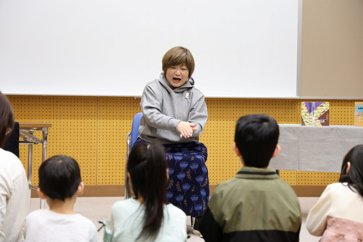 おはなし会が始まるまで子どもたちの相手をする小田川さん