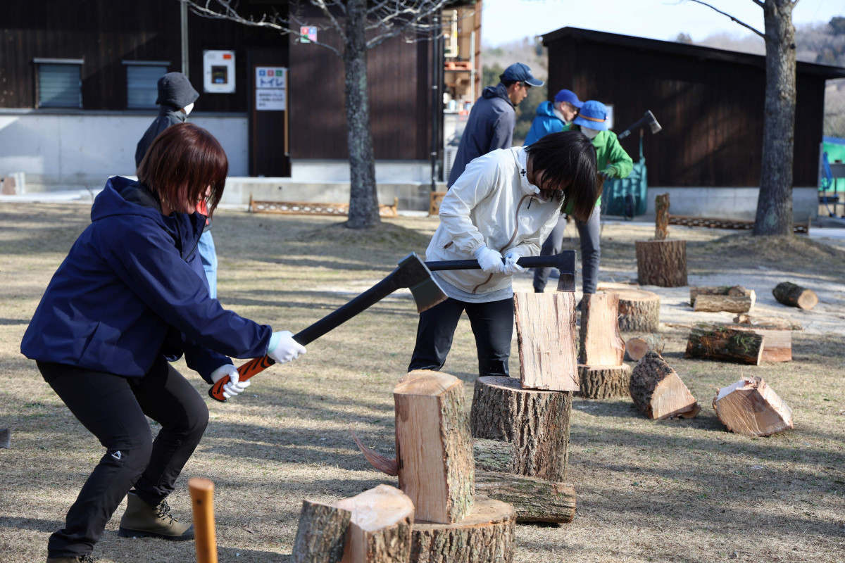 雲南のワイナリー「奥出雲葡萄(ぶどう)園」(雲南市木次町寺領)で2月23日、年に一度のまき割りが行なわれ、市内外から20人以上が参加した。