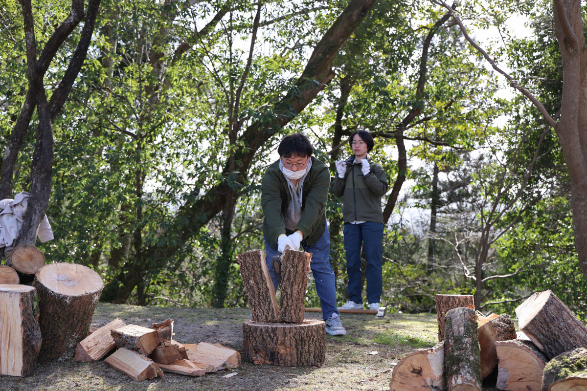雲南のワイナリー「奥出雲葡萄(ぶどう)園」(雲南市木次町寺領)で2月23日、年に一度のまき割りが行なわれ、市内外から20人以上が参加した。