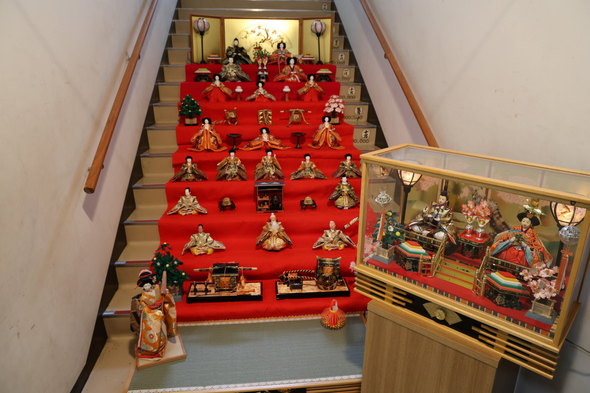 交流センターの階段にひな人形を飾った