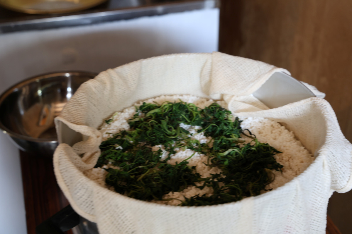ヨモギをもち米と一緒に蒸してよもぎ餅もついた