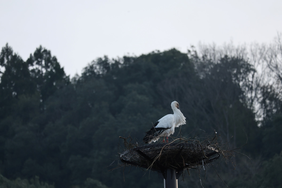 雲南の「コウノトリの会 春殖(はるえ)」が3月26日、大東中学校(雲南市大東町養賀)の入り口付近に新しい巣塔を建てた。
