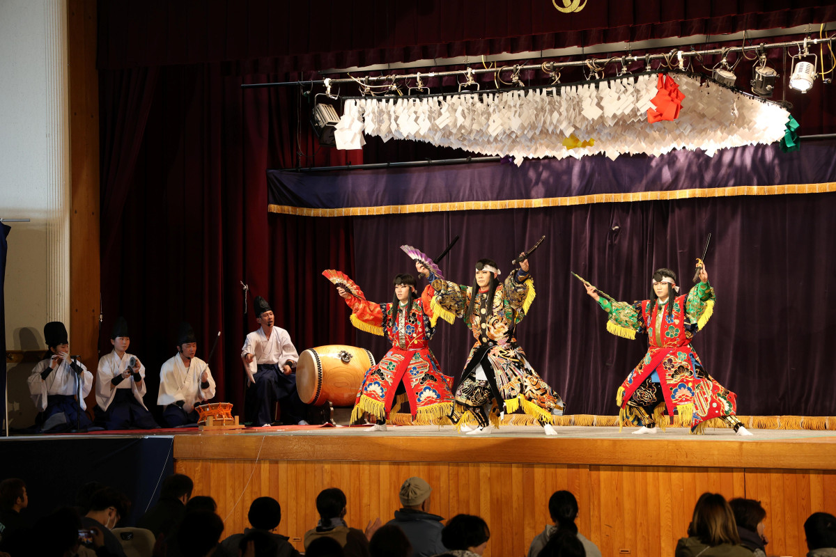 飯南・赤名の赤名農村環境改善センター(飯南町下赤名)で3月29日、飯南神楽団、穴笠神楽団(広島県三次市)、出羽神楽団(島根県邑南町)による神楽交流大会が開かれた。