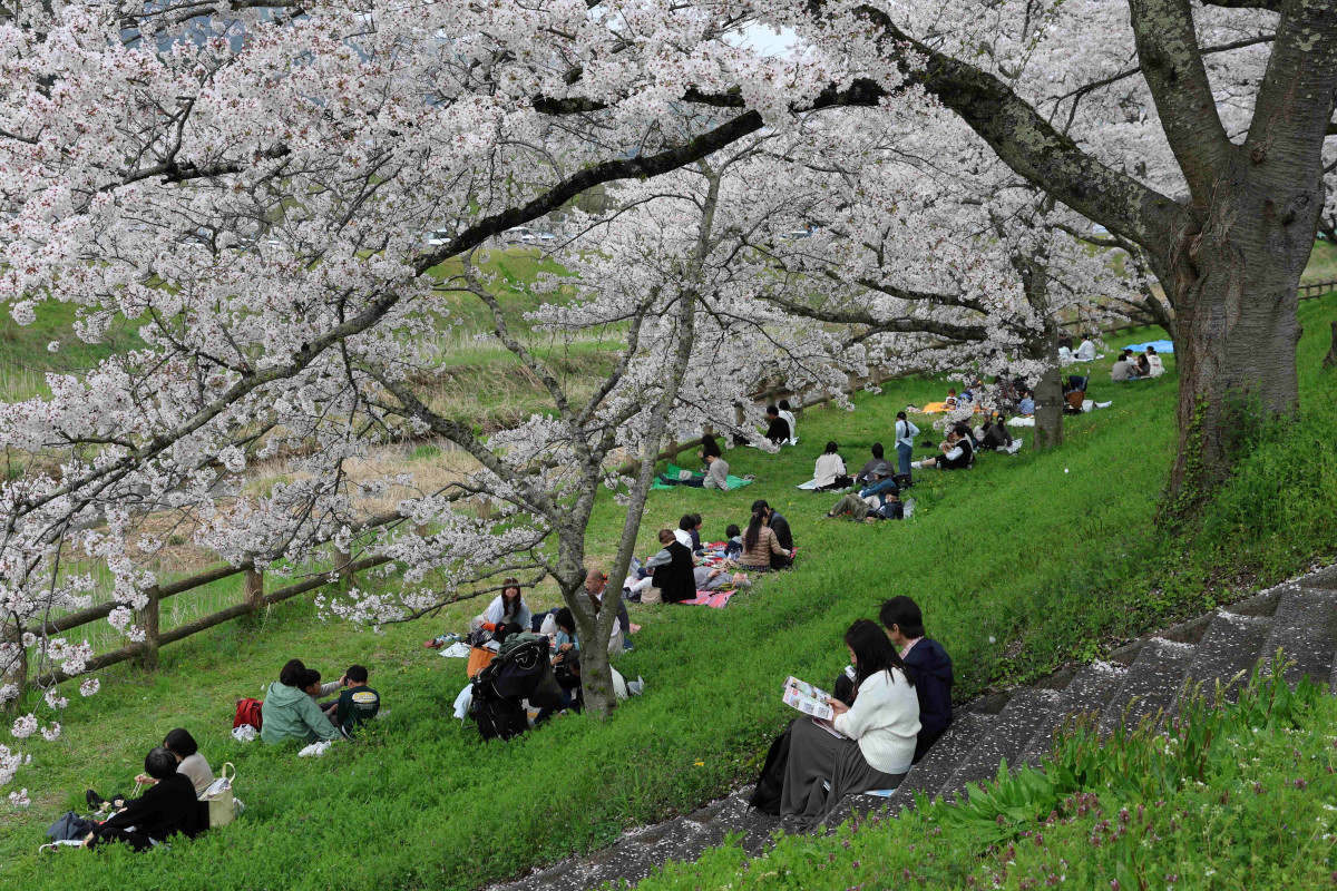 斐伊川土手の桜並木の下でシートを広げて花見を楽しむ人たち