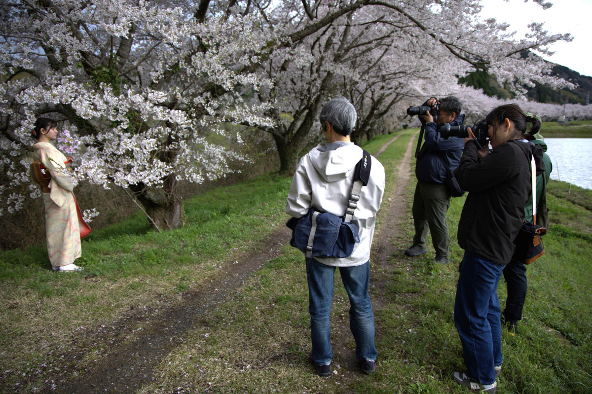 うんなんカメラ部が4月4日、雲南市三刀屋町の上熊谷桜並木で「さくら」をテーマにした撮影会を、初めてモデルを入れてポートレートの撮り方を学び、実践した。